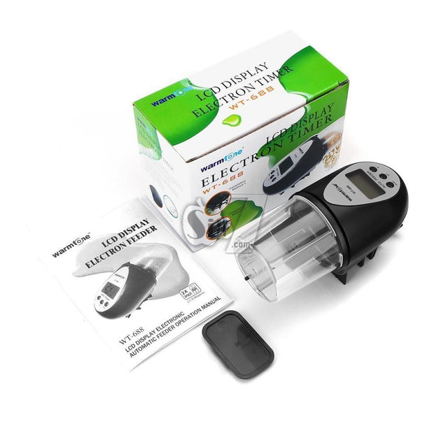 The Warmtone WT-688 is an automatic fish feeder for aquariums that can be programmed to feed fish on a schedule. It has an LED display that shows the feeder's working condition and allows you to easily check and operate it. The WT-688 can be set to feed fish up to twice a day, once every 24 hours, once every 48 hours, or once every 72 hours. It also has an air connection to keep the food dry.