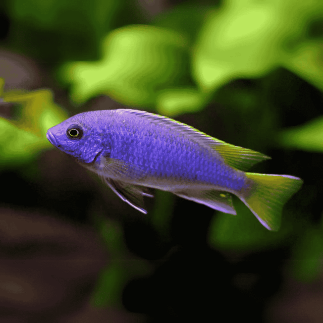 The Yellow Tail Acei is a captivating species of Mbuna cichlid native to Lake Malawi in Africa. This fish is known for its striking color combination, featuring a deep bluish or purplish body and vibrant yellow or golden tail and fin tips, which add a bright contrast. It has a streamlined body shape typical of Mbunas, with bold, inquisitive eyes and slightly rounded dorsal and caudal fins.