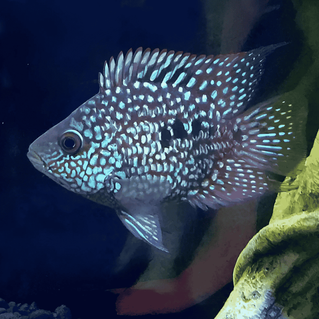 Bring color, charm, and tranquility to your aquarium with the enchanting Balloon Green Texas Cichlid.