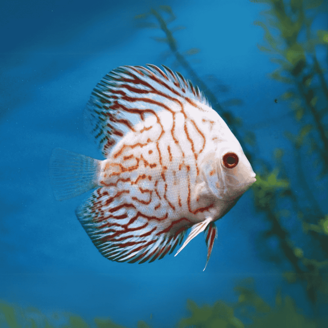 Color and Pattern: The Red Map Discus is characterized by its stunning red and white marbled or patterned body. The base coloration is white or light cream, with rich red markings that form intricate, map-like patterns across the body and fins. As the fish grows, these patterns become more defined and vibrant, making it one of the most visually striking Discus varieties.