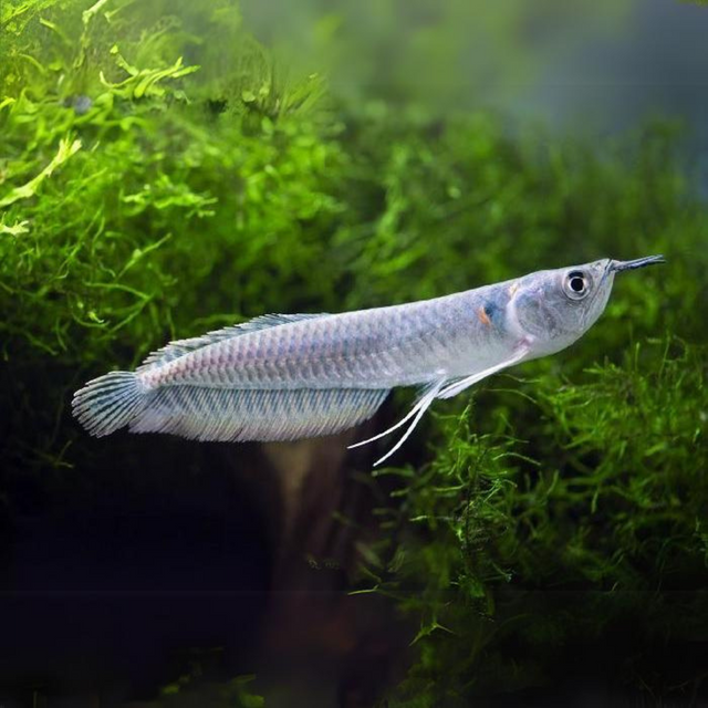 In terms of diet, the Silver Arowana is carnivorous and should be fed a varied diet that includes live or frozen foods such as fish, shrimp, and insects. Regular feeding with high-protein foods will support its growth and health.