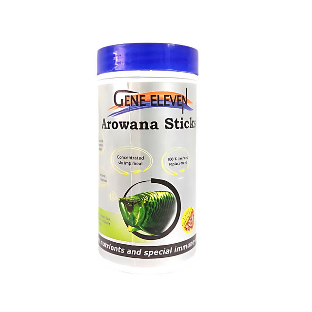 Gene Eleven Arowana Sticks 90gm is a specialized floating fish food designed to meet the dietary requirements of arowanas and other large carnivorous fish. These sticks provide essential nutrients for healthy growth, vibrant coloration, and overall vitality, ensuring your arowana remains active and well-nourished.