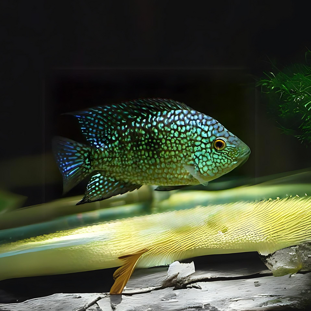 This cichlid thrives in well-maintained aquariums with clean water, moderate to high filtration, and a balanced diet that includes both protein-rich foods and vegetable matter. Due to its semi-aggressive nature, it is best kept with similarly sized and temperament-matching tank mates. The Green Texas Cichlid is an excellent choice for hobbyists who appreciate vibrant, energetic fish with a bit of attitude.